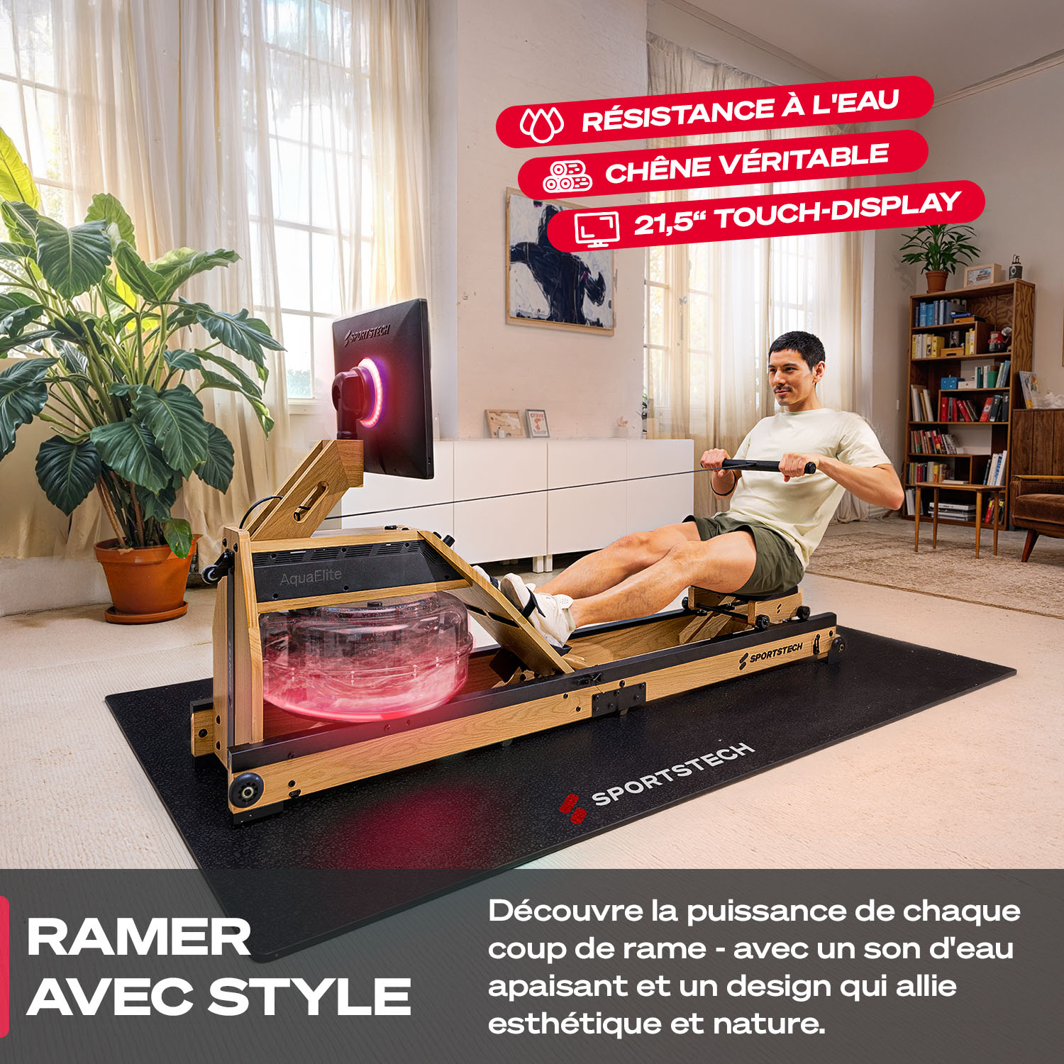Der AquaElite ist das Premium Wasserrudergerät von Sportstech – und setzt neue Maßstäbe. Es besteht aus edlem Massivholz, verfügt über elegante Ledergriffe und bringt mit dem 21,5" HD-Touchscreen modernste Technik direkt in dein Wohnzimmer. So holst du dir das volle Sportstech Live Erlebnis nach Hause – mit geführten Workouts, beeindruckenden Landschaftsvideos, Rezepten und deinen liebsten Streaming-Diensten.