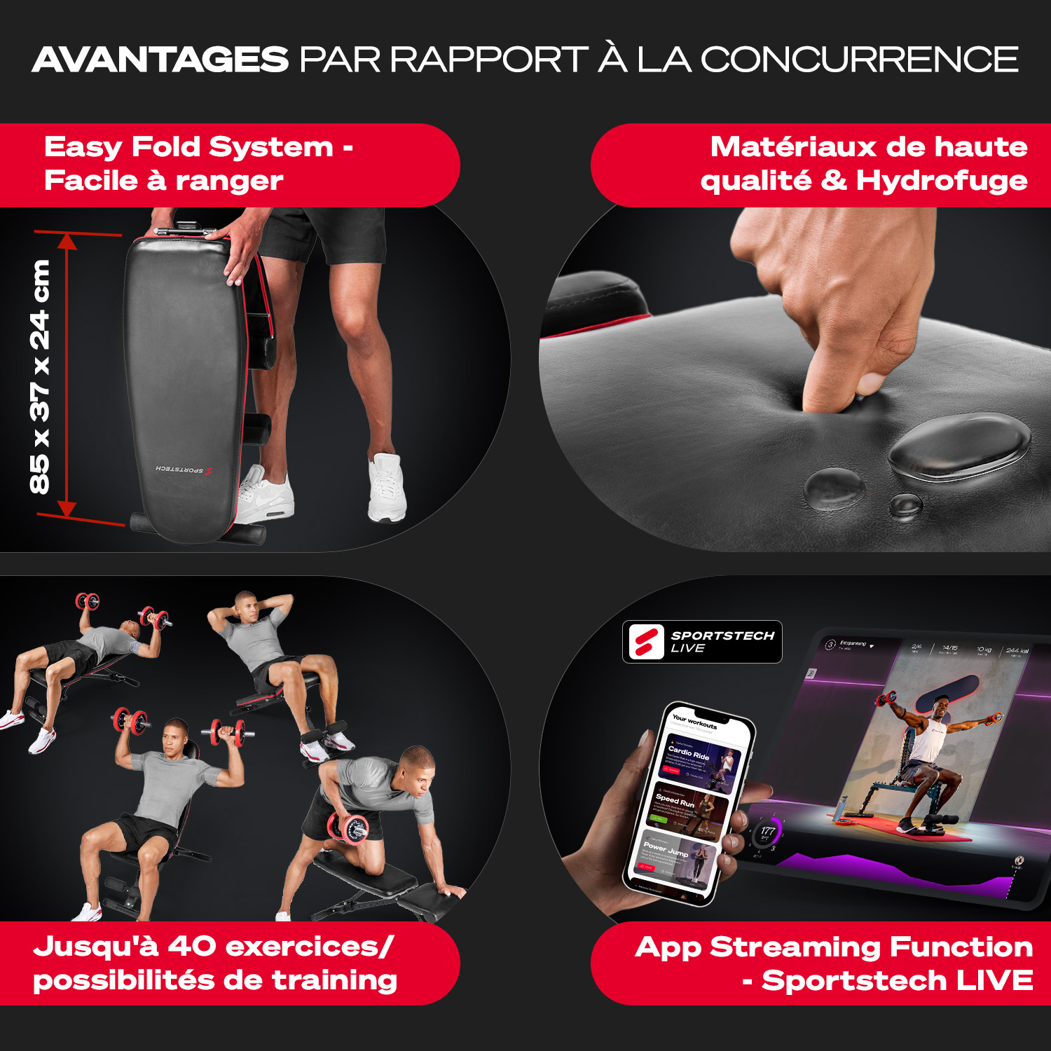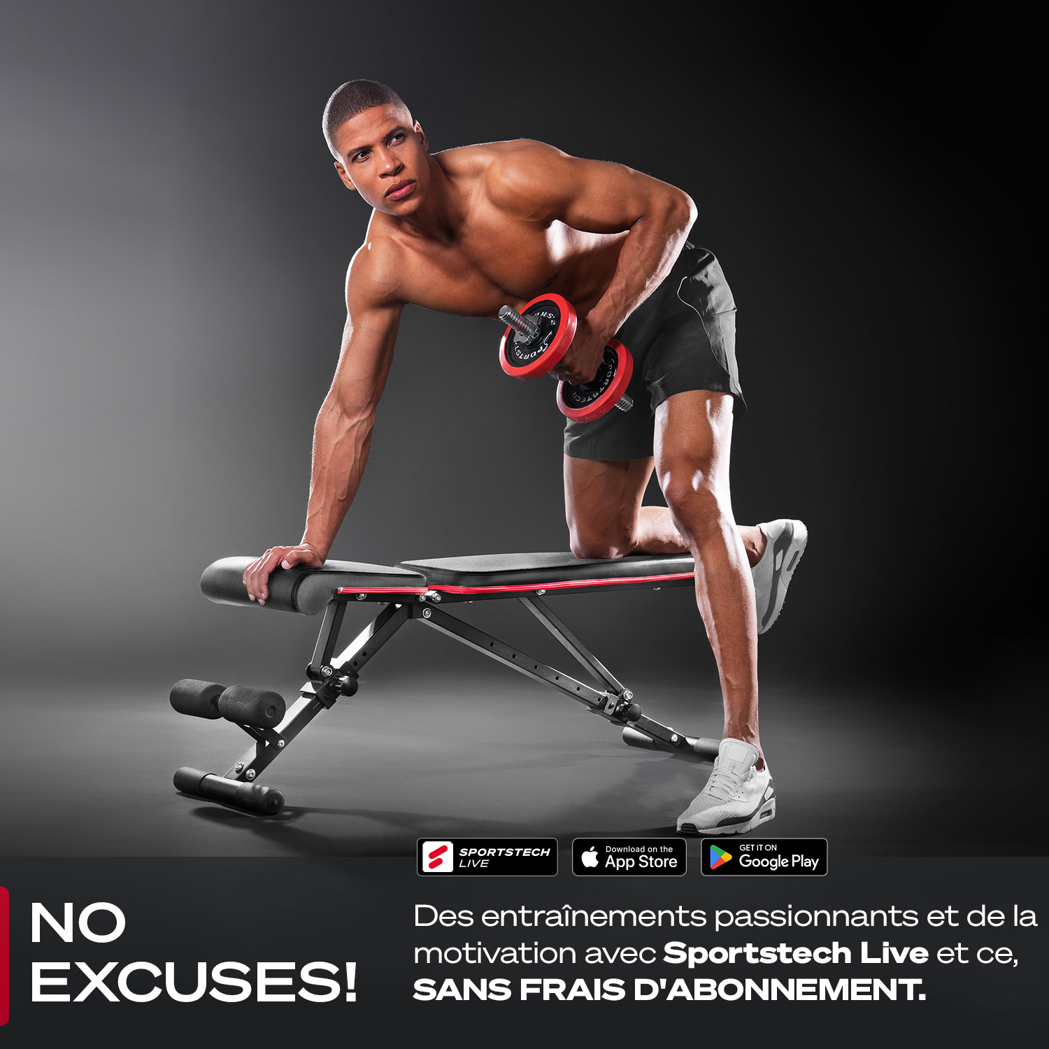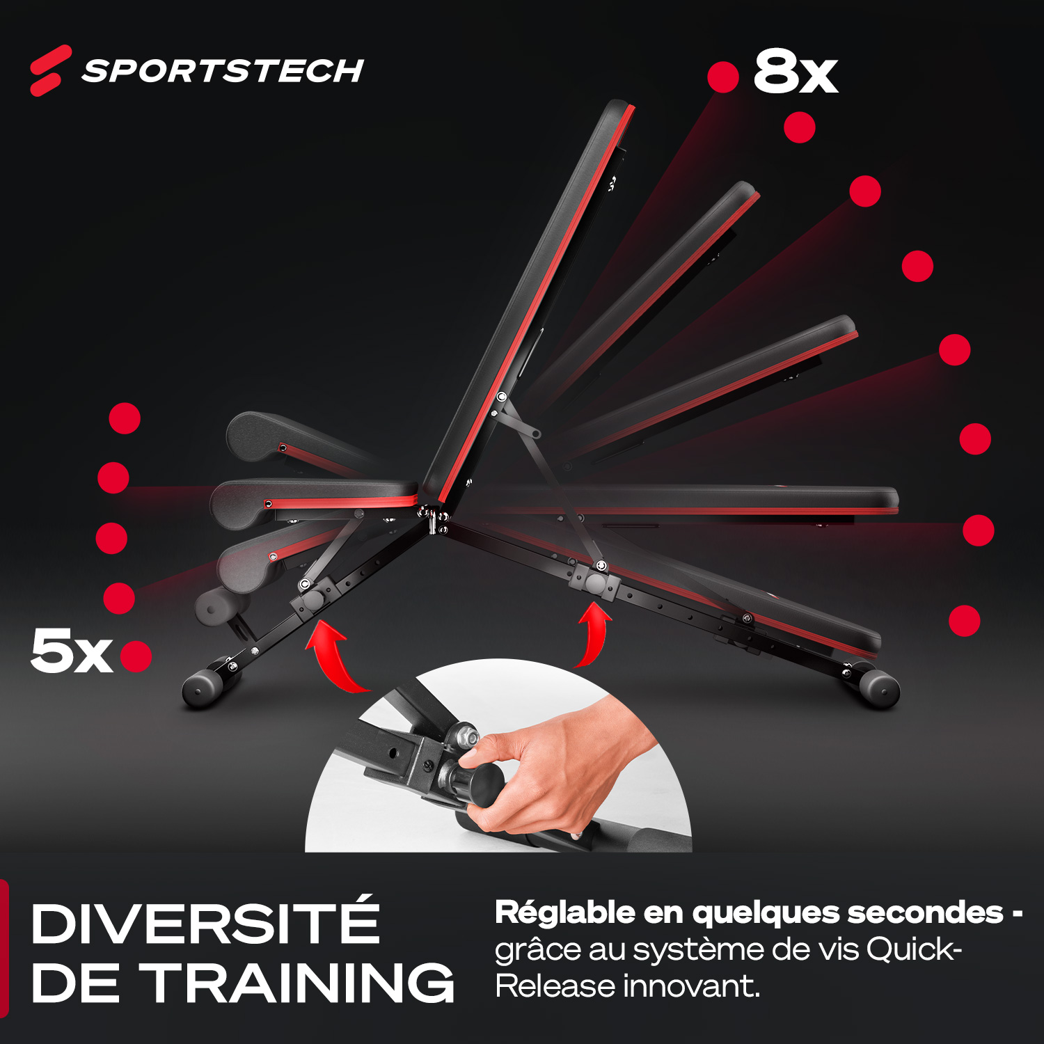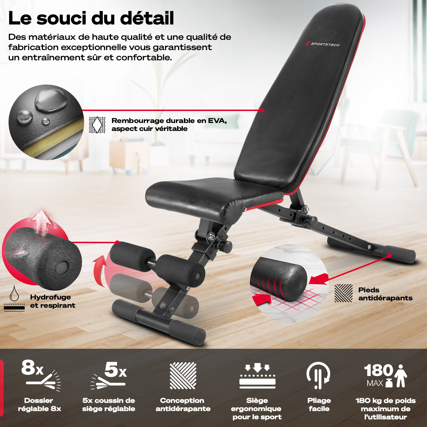 L’ingénieux appareil de fitness pour la maison séduit par sa grande flexibilité à l'entraînement et par son système de pliage facile qui le rend peu encombrant. Chez SPORTSTECH nous voulons que chacun ait la possibilité de se maintenir en forme en faisant du sport chez lui. Pour cette raison notre banc de musculation innovant peut être plié en peu de gestes pour atteindre les dimensions de 85 x 37 x 24 cm et, extra-compact, être rangé sous ou à côté de tes meubles. Dégage le chemin vers un training flexible dans ta salle de sport à domicile.