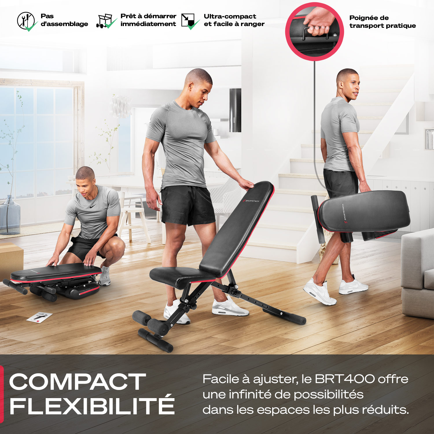 Une salle de sport à domicile s'accompagne souvent d'un problème de place. Avec l’ingénieux banc de musculation BRT400 ce n’est pas le cas. Grâce à sa conception intelligente il est très simple à installer et très facile à ranger en seulement quelques secondes. Après ton training, une fois replié il ne fait plus que 24 cm de haut et très compact se range n'importe où. Encore mieux : ton banc de fitness t’est livré déjà entièrement assemblé. L'effort que tu as à faire pour le monter est minimal et tu peux commencer directement ton entraînement !