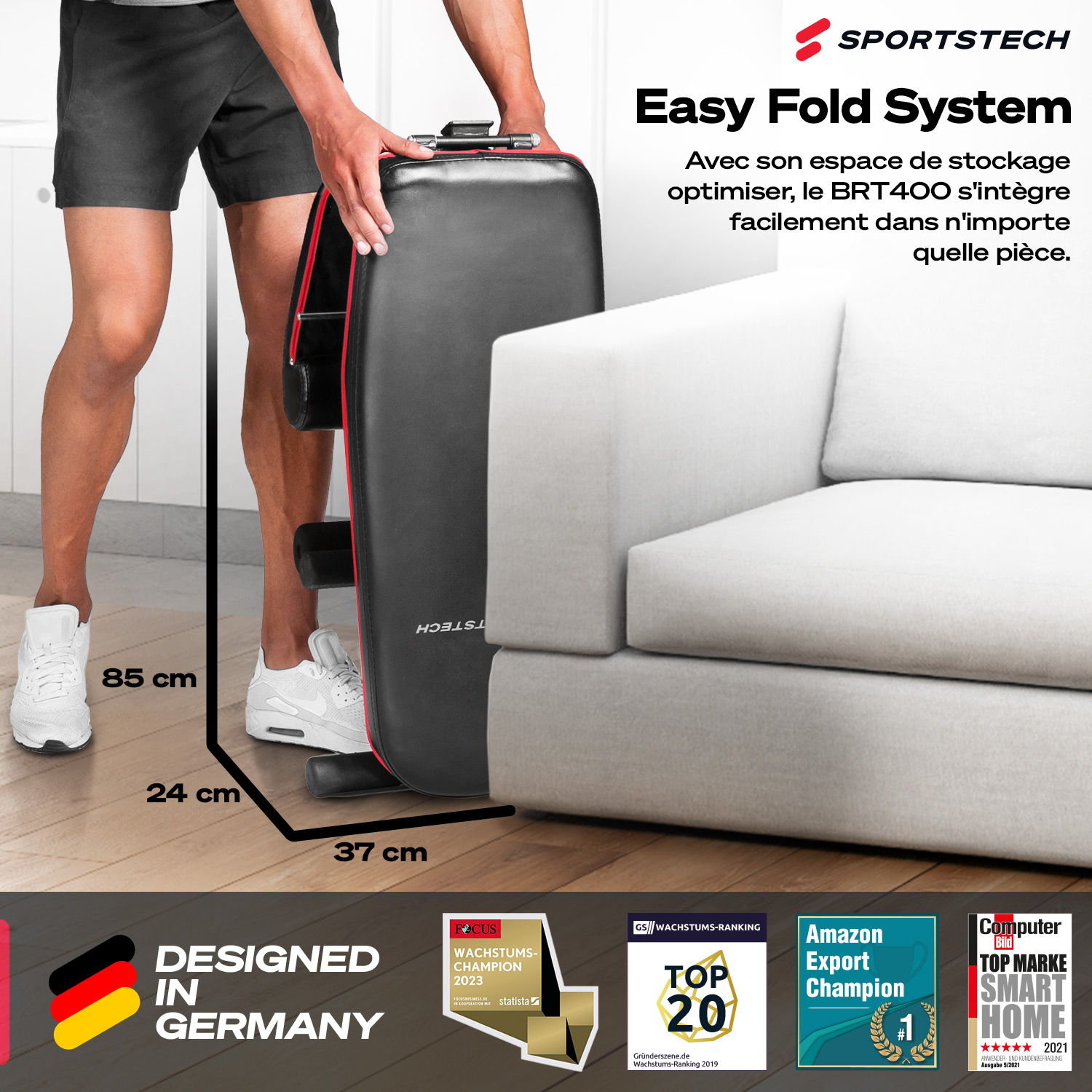 Tu aimerais atteindre un nouveau niveau en musculation et t’entraîner chez toi avec autant de polyvalence qu’à la salle de sport ? Alors le BRT400 banc de musculation de SPORTSTECH te convaincra par sa construction extra-stable et ses 40 possibilités de réglage qui t’offriront des entraînements très variés ! La qualité SPORTSTECH, recouvert d'un rembourrage EVA inusable et de grande qualité, le BRT400 offre un appui fiable grâce à sa conception antidérapante. Très malin : le système Easy-folding permet un pliage et un rangement ultra-compact !