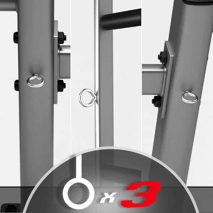 Notre objectif est de concevoir nos appareils pour qu'ils soient aussi polyvalents que possible. C'est pourquoi nous avons équipé notre KS400 de crochets pratiques. Le crochet central permet de suspendre un sac de boxe, tandis que les deux crochets extérieurs offrent la possibilité de s'entraîner avec des sangles, des bandes TRX ou des cordes de force.