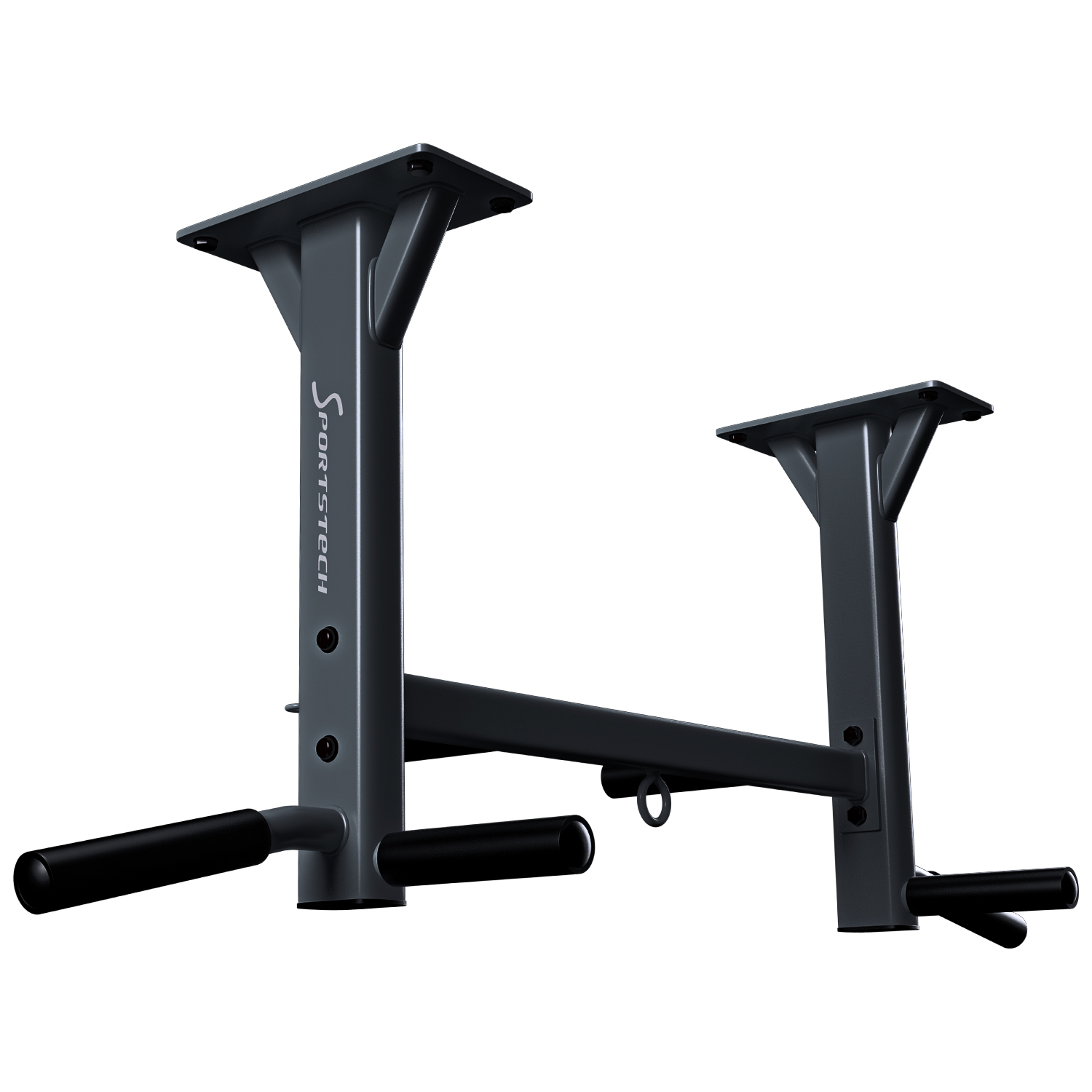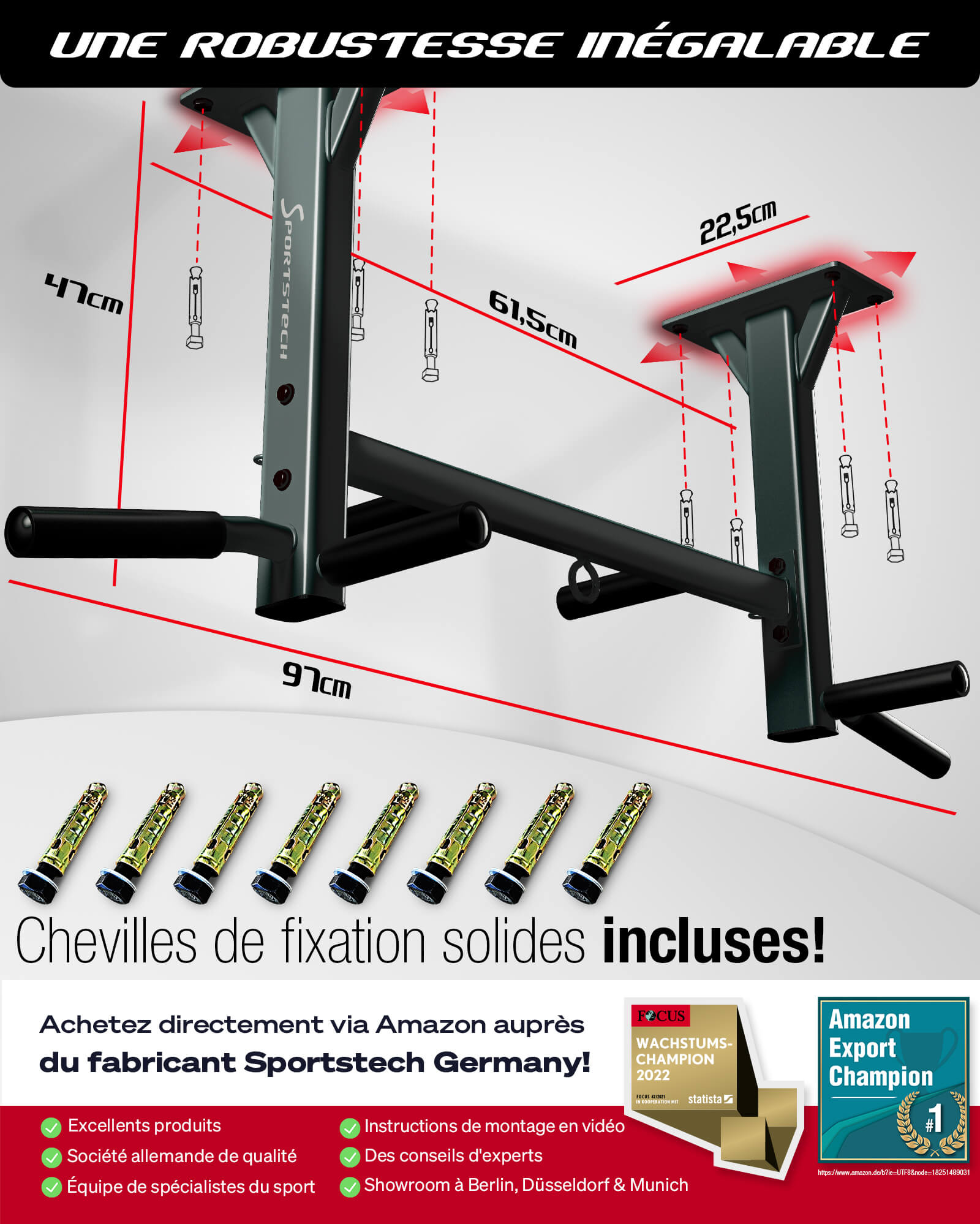 L'entraînement avec une barre de traction est incroyablement polyvalent. Outre la traction classique, qui fait déjà travailler extrêmement de nombreux muscles en même temps, vous pouvez également réaliser divers exercices pour les jambes et l'abdomen avec elle. Mais chez Sportstech, la polyvalence ne nous suffit pas, c'est pourquoi nous avons conçu la KS400 de manière à ce que vous puissiez élargir votre plan d'entraînement avec d'innombrables exercices. Ainsi, nous avons équipé la KS400, par exemple, d'anneaux permettant de suspendre un sac de frappe ou d'offrir un entraînement avec des cordes de puissance, des bandes TRX ou des sangles.