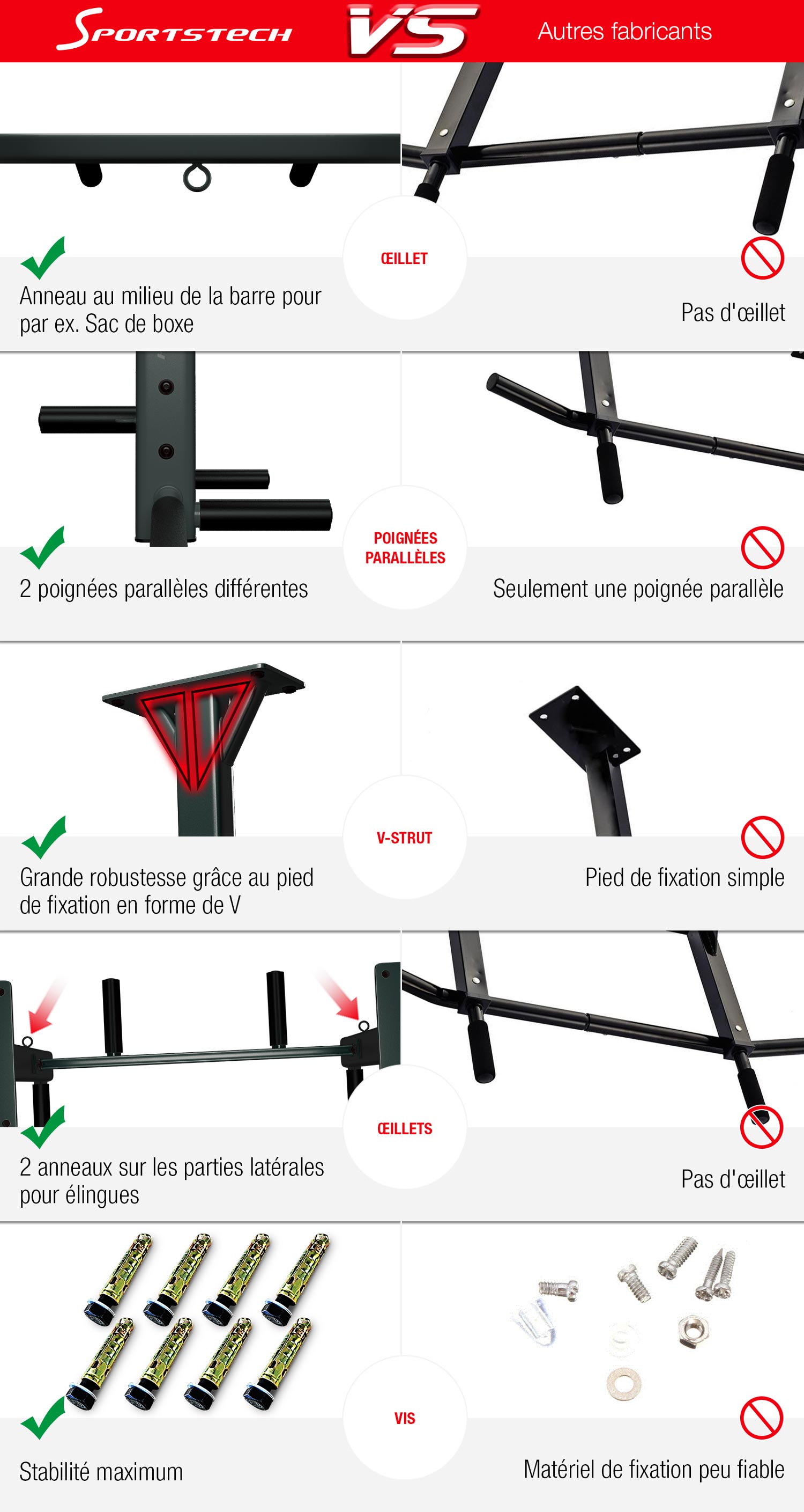 Saisissez la barre de traction professionnelle en position large, parallèle ou étroite. Les 6 poignées antidérapantes vous offrent des possibilités illimitées pour vos exercices.