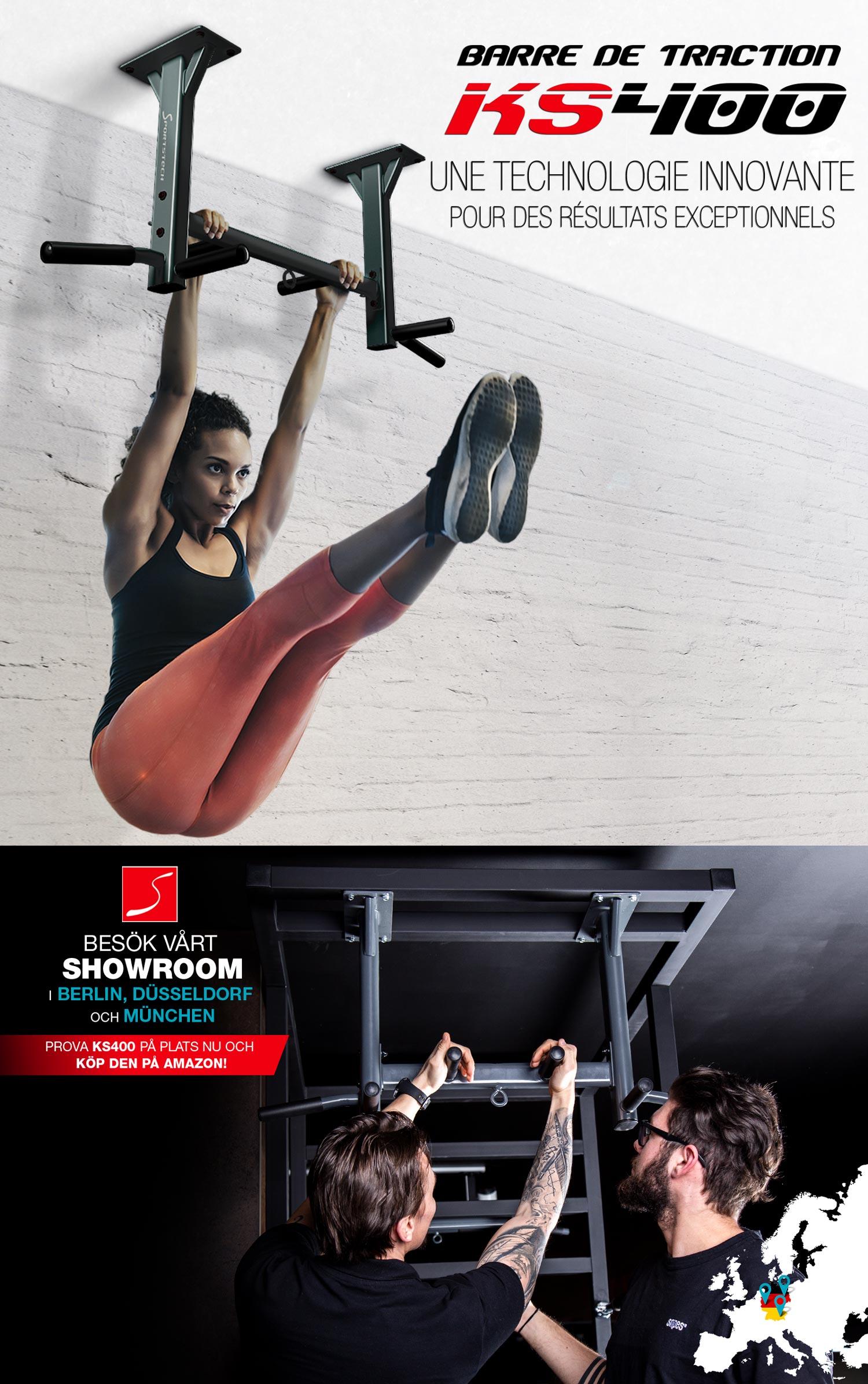 La KS400 est montée directement sur le mur, ce qui présente plusieurs avantages. Outre une stabilité maximale (charge max. 300 KG) et une très haute sécurité, elle est également idéale pour les exercices très dynamiques et permet, du fait qu'elle peut être installée plus haut qu'un cadre de porte par exemple, un étirement complet du corps.