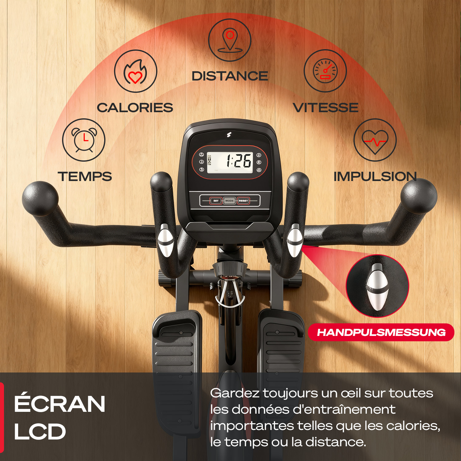 - Écran LCD : temps, distance, vitesse, watts, calories, fréquence cardiaque, compteur de kilomètres