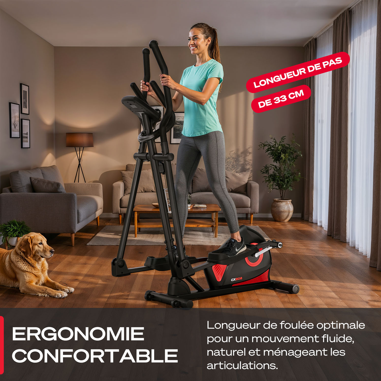 - Avec fonction de mesure du pouls aux poignées, roulettes de transport et support pour smartphone/tablette