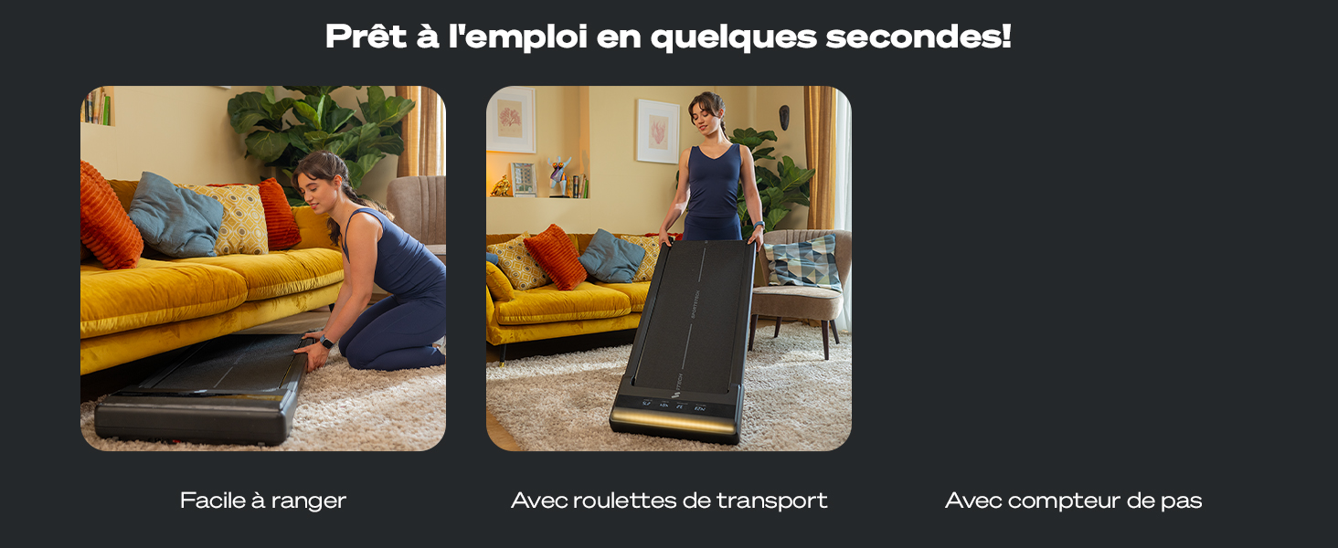 Grâce à son design compact (seulement 12,5 cm de hauteur) et à ses roulettes de transport intégrées, le sWalk Lite Walking Pad est particulièrement facile à ranger :