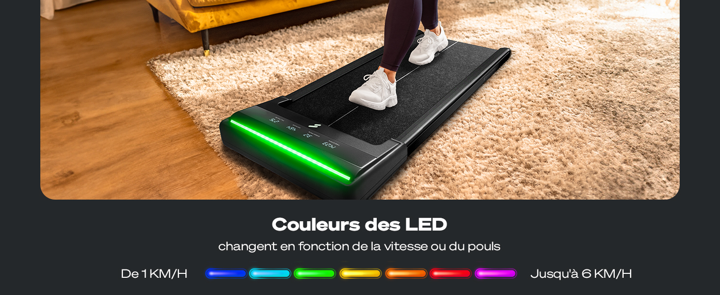 Le sWalk Lite Walking Pad est doté d’une fonction LED innovante et brevetée, qui change de couleur en fonction de la vitesse :