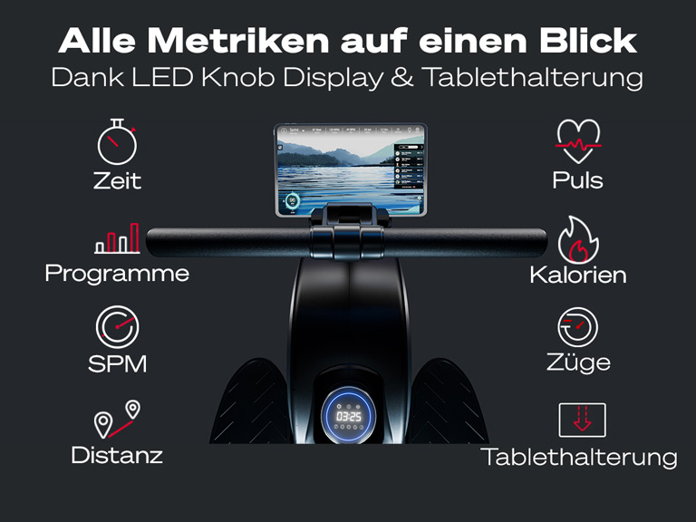 Das innovative LED-Knob-Display zeigt dir immer alle wichtigen Leistungsdaten an: Zeit, Distanz, Puls, Watt, SPM (Züge pro Minute), Kalorien, Widerstandsstufen (32 Stufen verfügbar)