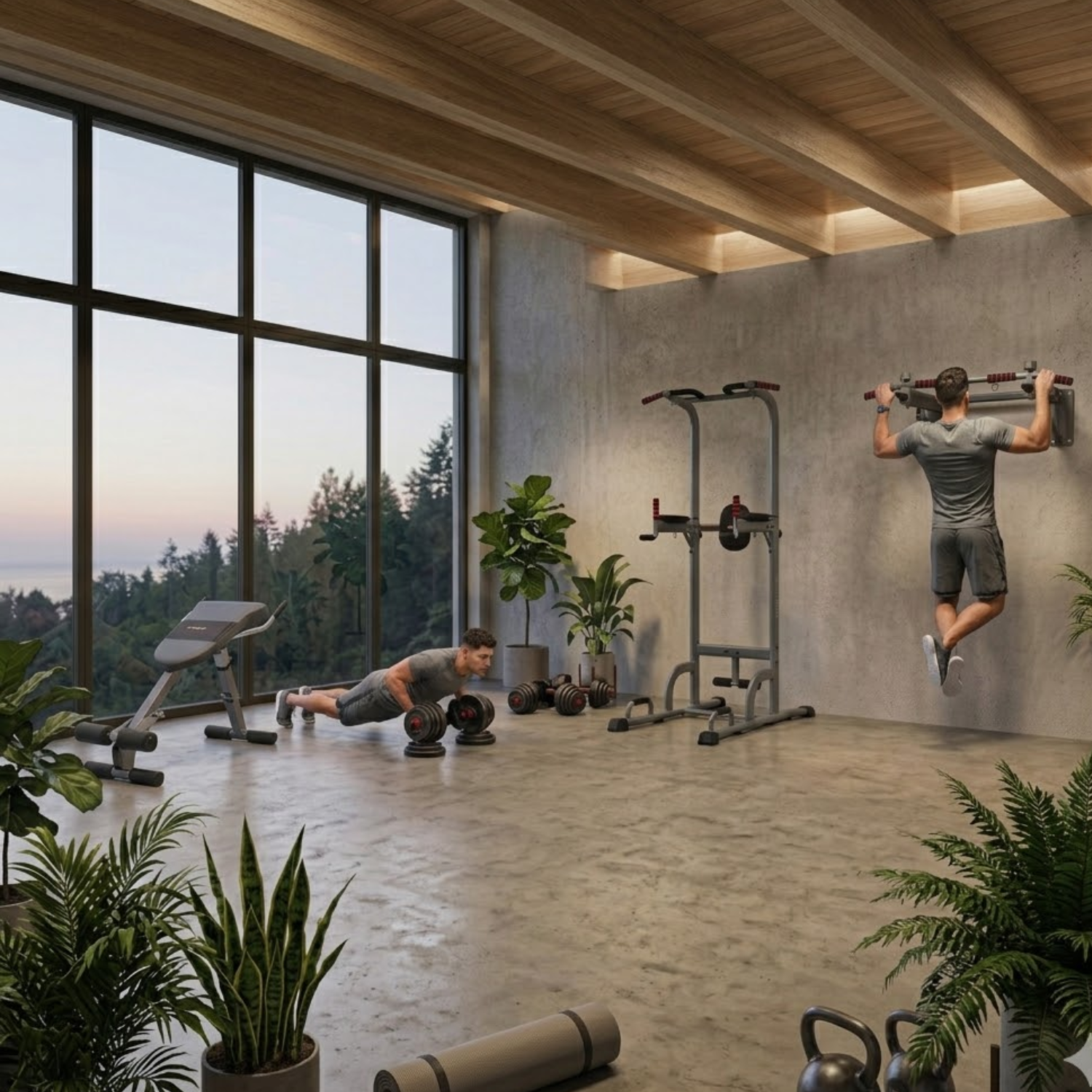 Une barre de traction et des haltères ajustables sont idéaux. Ils offrent un bon équilibre entre simplicité et efficacité.