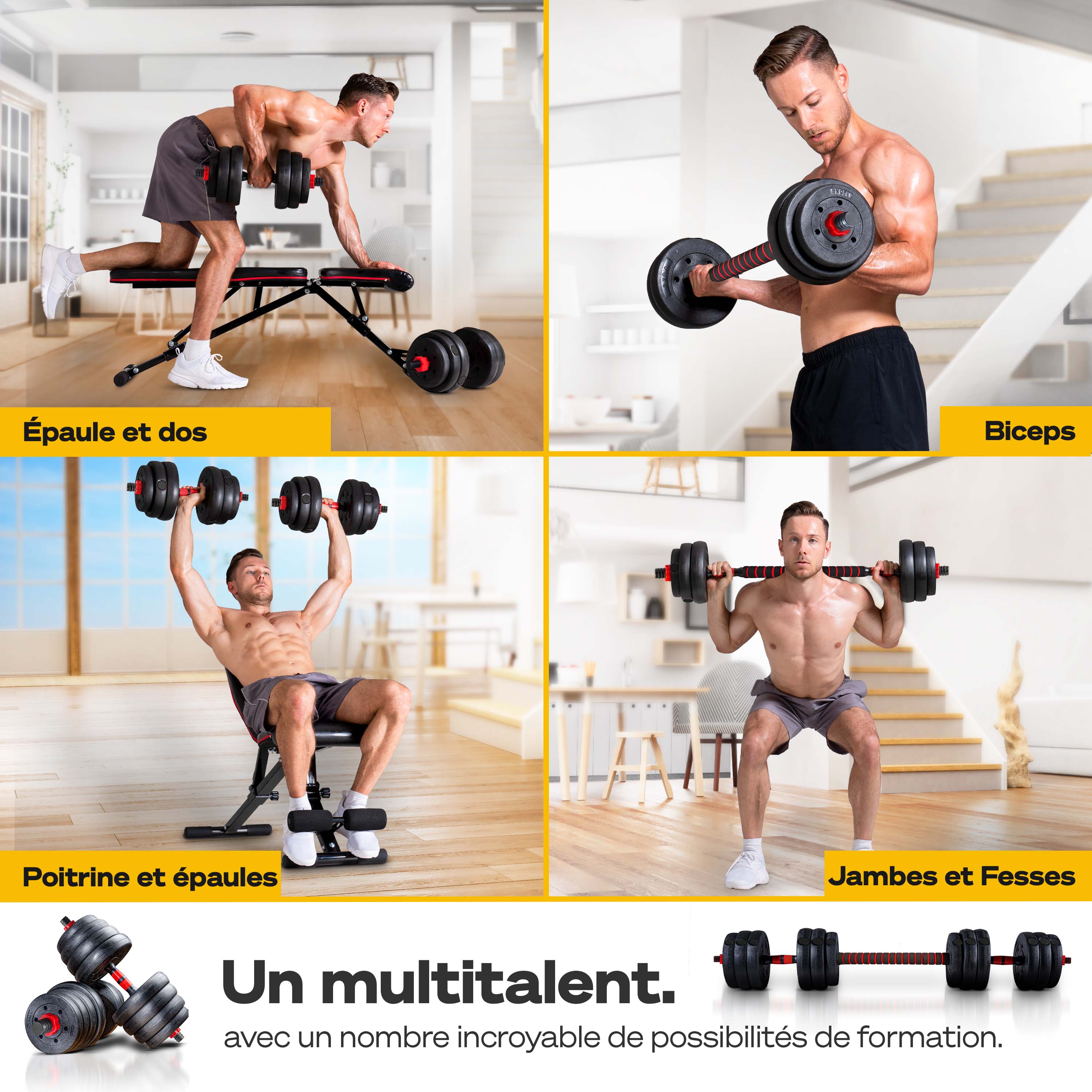 - Grande variété d’entraînements : Haltère et barre en un seul produit, conversion facile, nombreuses possibilités d’exercices.