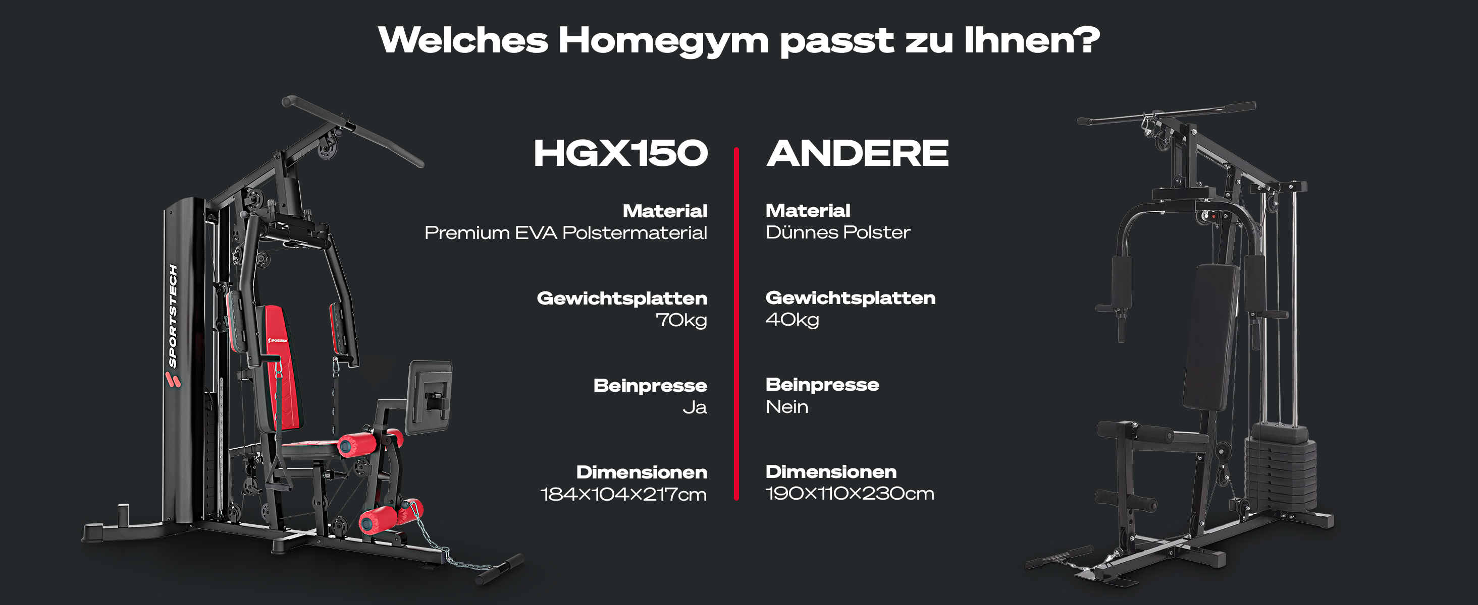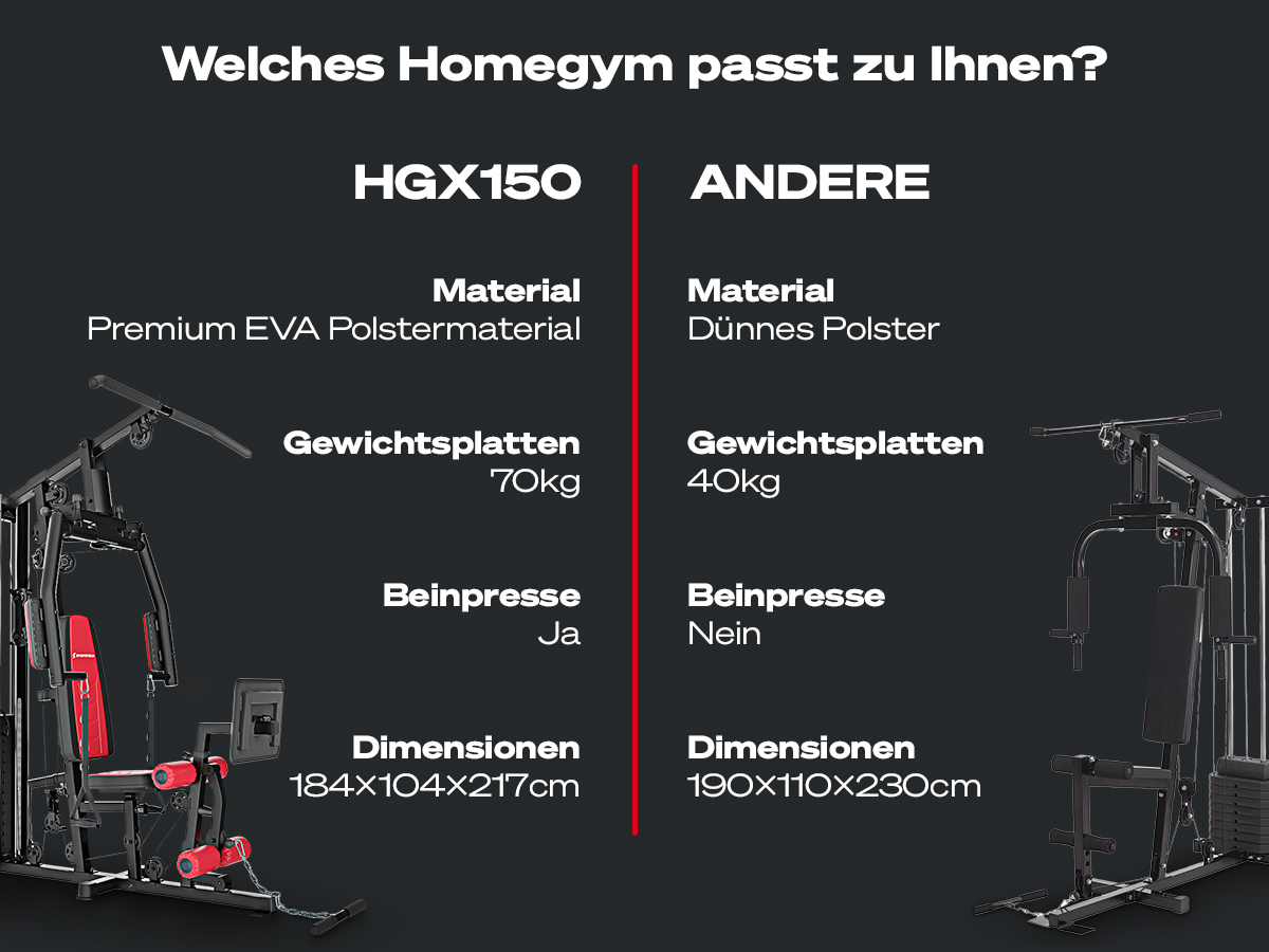 Die HGX150 ist besonders kompakt und benötigt nur etwa 2 m² Stellfläche. Damit ist sie ideal für Home Gyms und kleinere Trainingsräume geeignet.