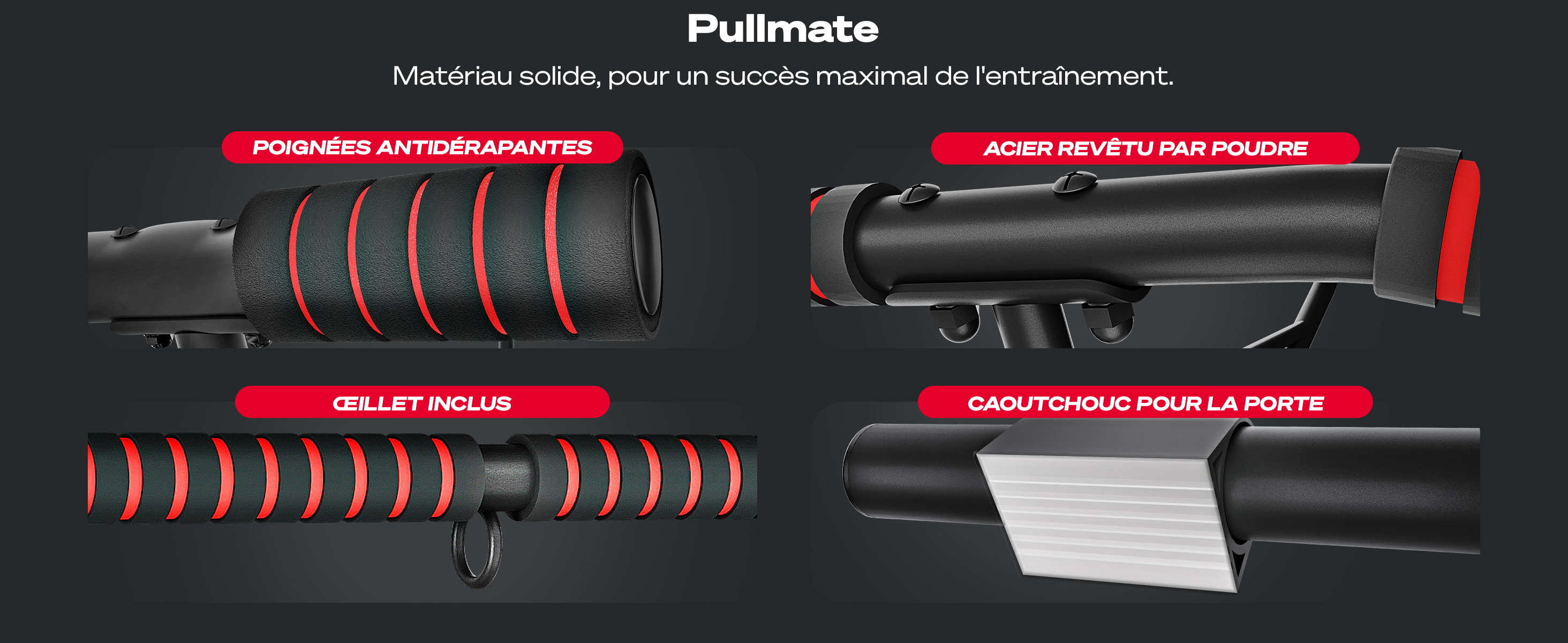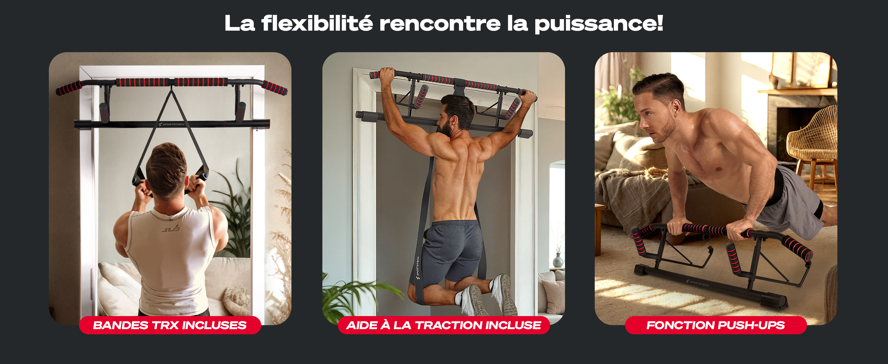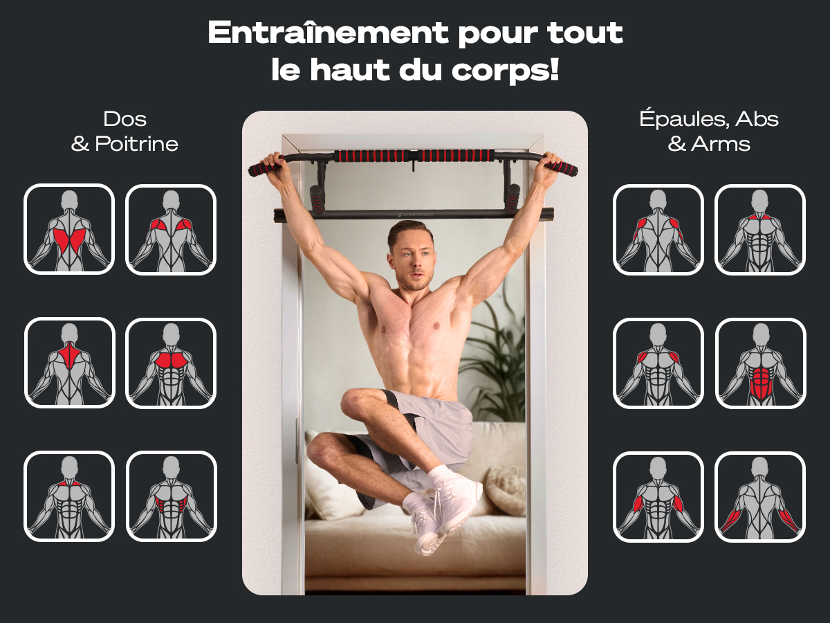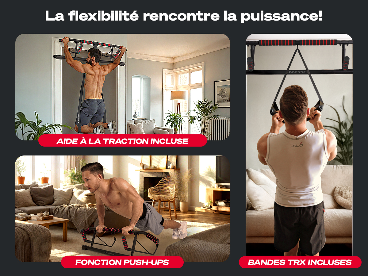 - Inclus : bandes d’assistance pour tractions et sangles TRX