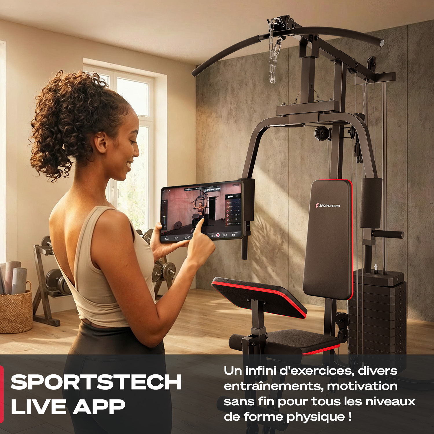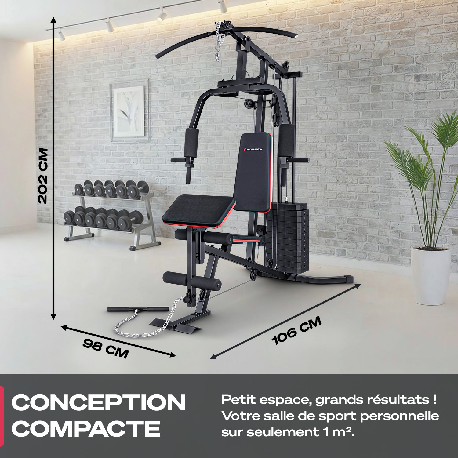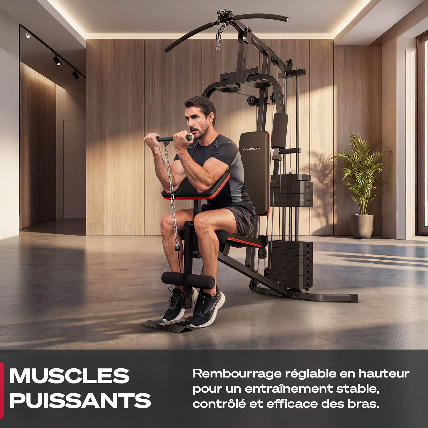 - Équipement complet avec barre de tirage, pupitre pour curl biceps, extension des jambes et bras butterfly