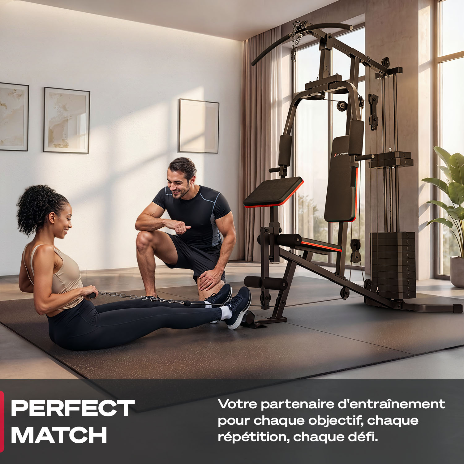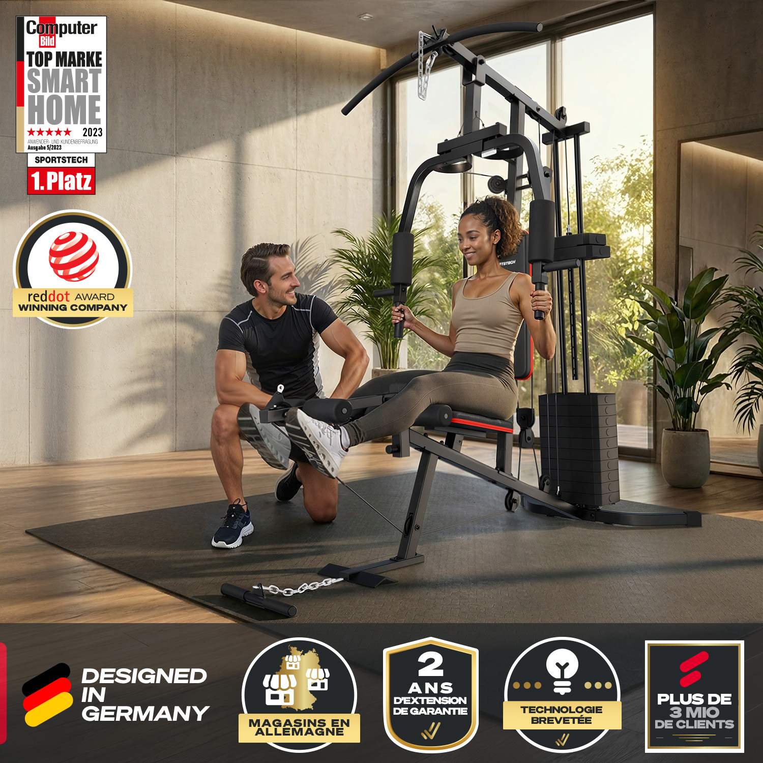 Une station de musculation est un appareil de fitness multifonction conçu pour l’entraînement complet du corps. Elle permet de travailler efficacement tous les groupes musculaires à la maison – des pectoraux et du dos jusqu’aux bras et aux jambes.