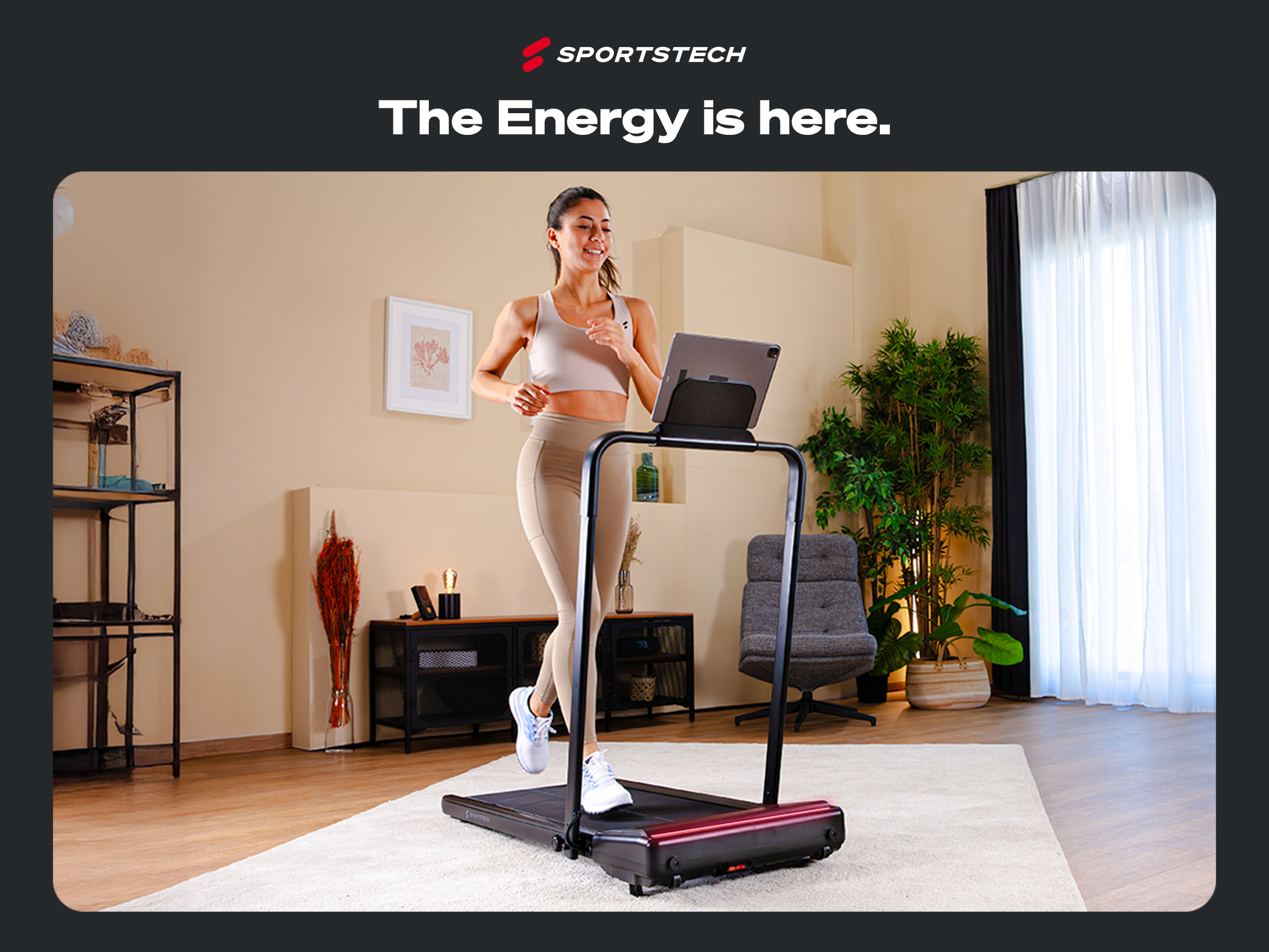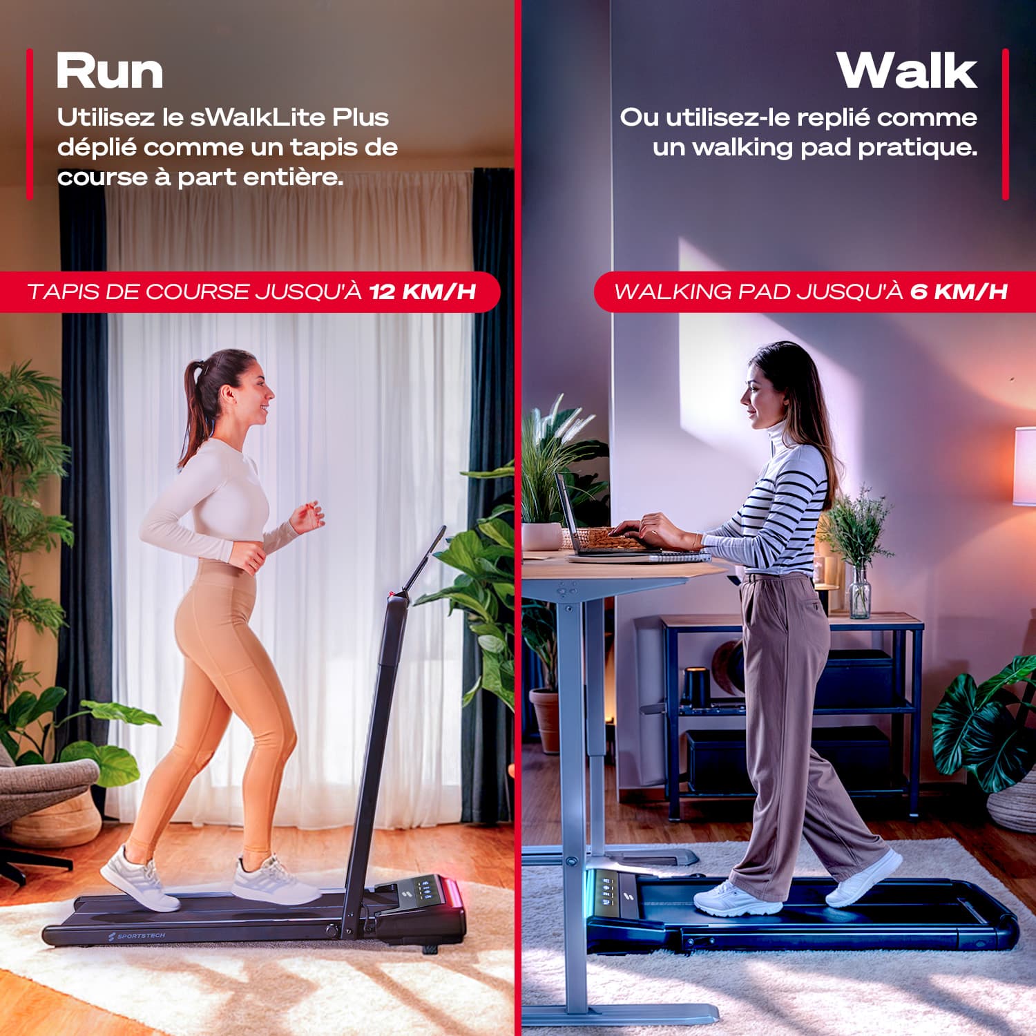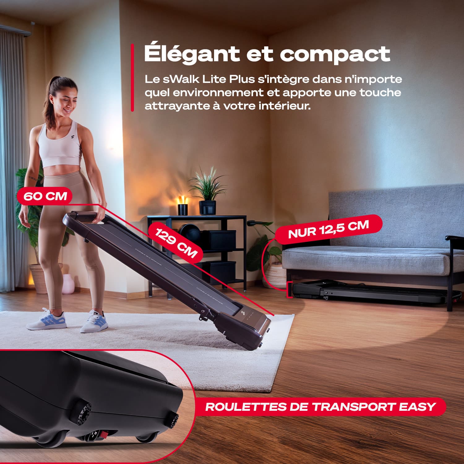 Le sWalk Lite Plus est un tapis de course 2-en-1 qui peut être utilisé comme tapis de course classique jusqu’à 12 km/h, ou en mode bureau comme tapis de marche jusqu’à 6 km/h sous le bureau. Il combine design moderne et technologie innovante, idéal pour rester actif même avec peu d’espace ou en travaillant.
