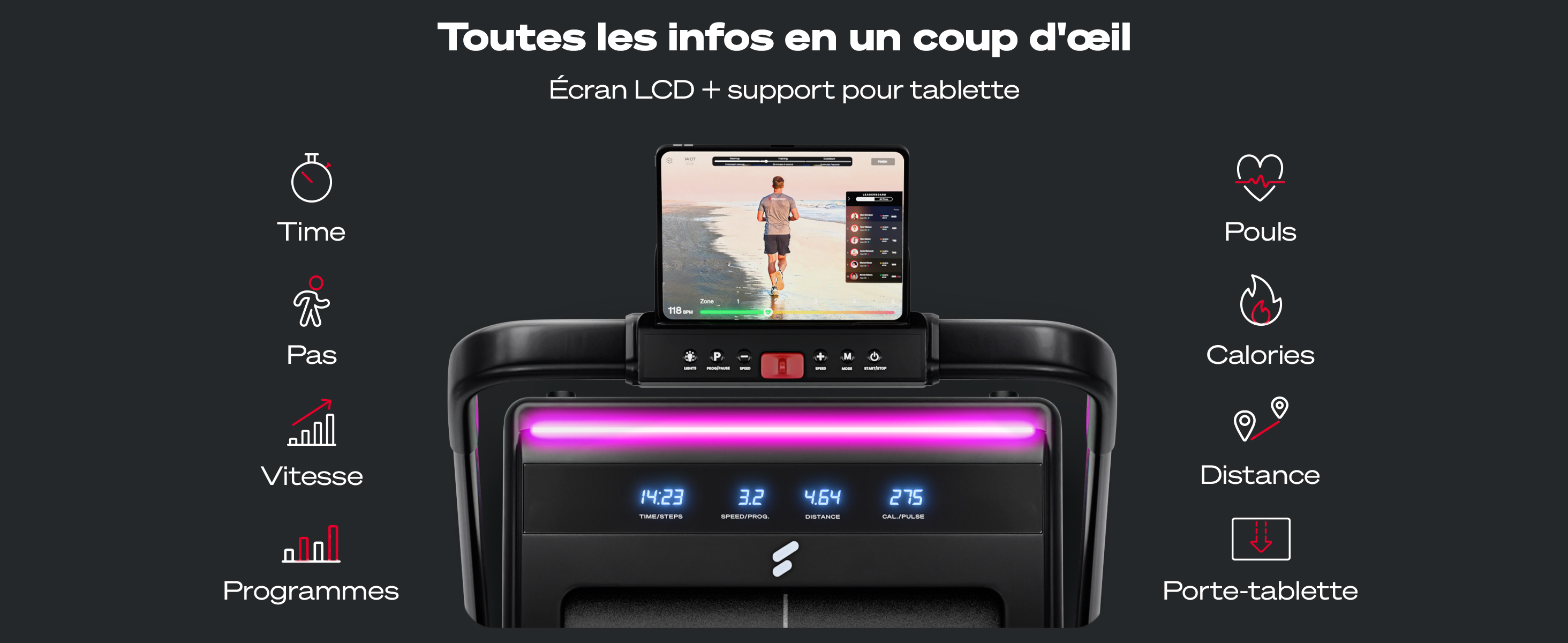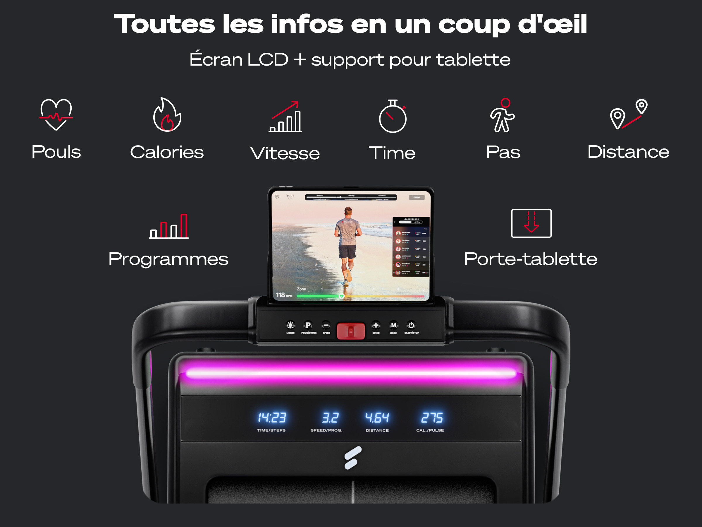 - Fonction LED brevetée affichant en temps réel vitesse, pas et pouls
