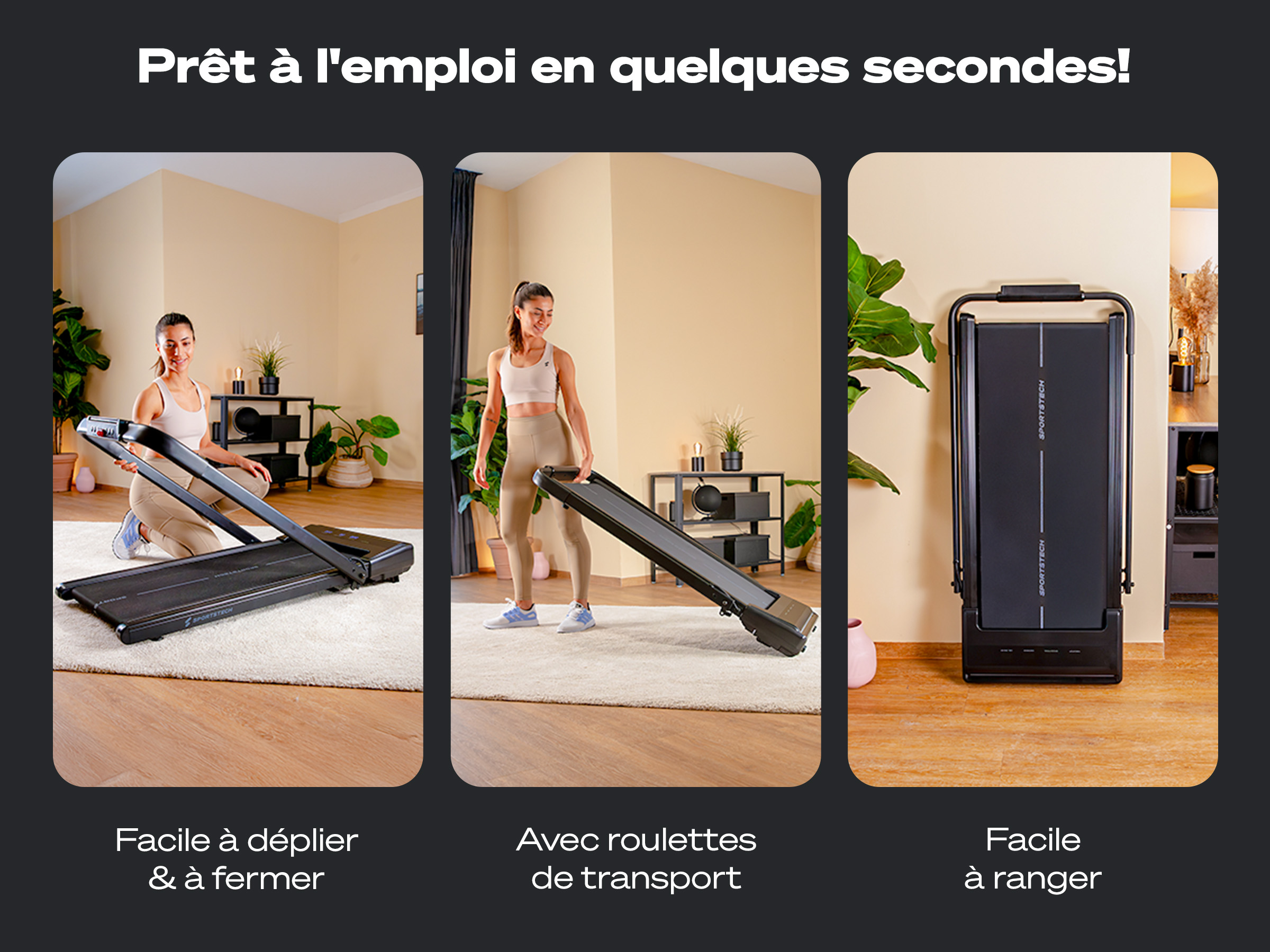 Grâce à ses dimensions compactes et sa faible hauteur une fois plié (seulement 12,5 cm), il peut être glissé sous un bureau. En mode marche, vous pouvez rester actif tout en travaillant, sans devoir prévoir du temps séparé pour faire du sport.
