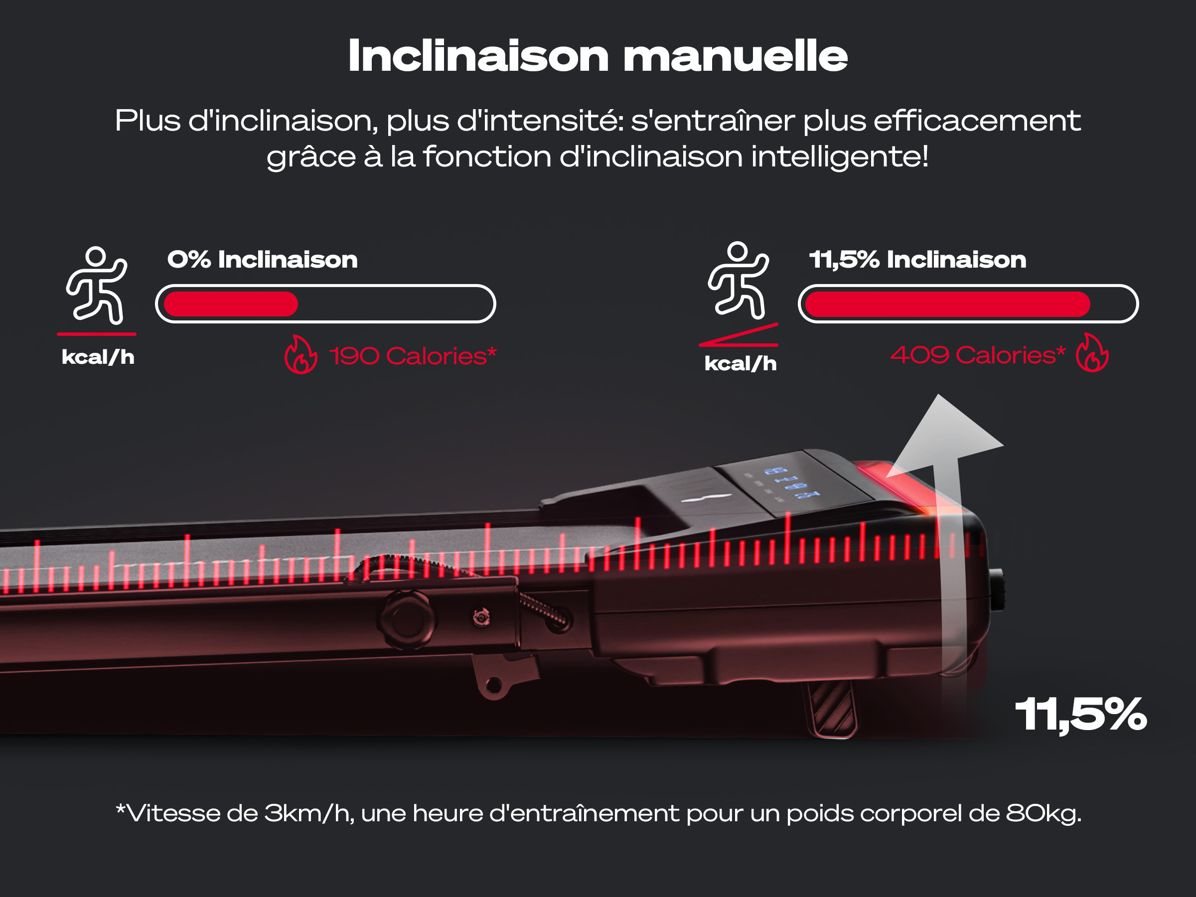 Oui, le sWalk Lite Plus offre une inclinaison de 11,5 % pour un entraînement plus intense. Les supports d’inclinaison se trouvent à l’avant sous le moteur et doivent être déployés manuellement pour régler l’inclinaison.