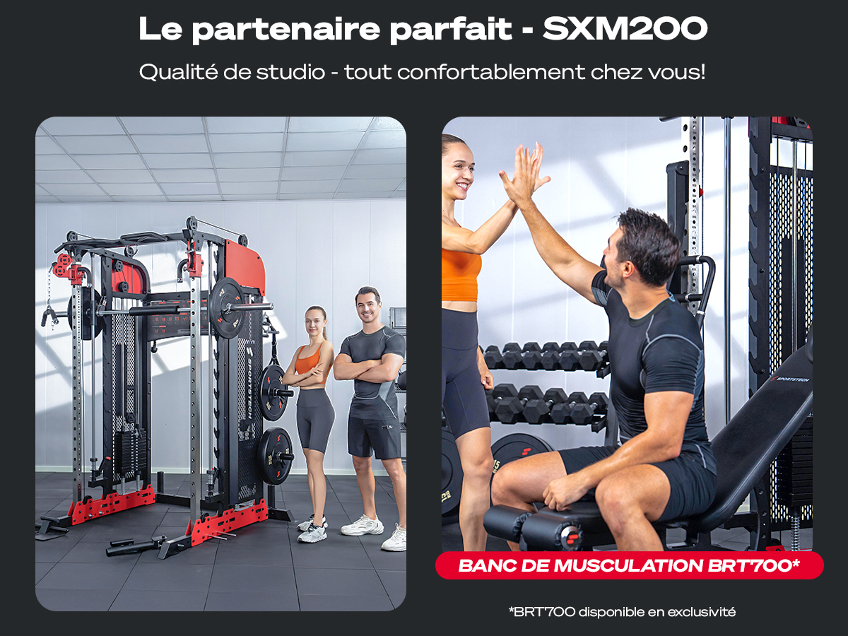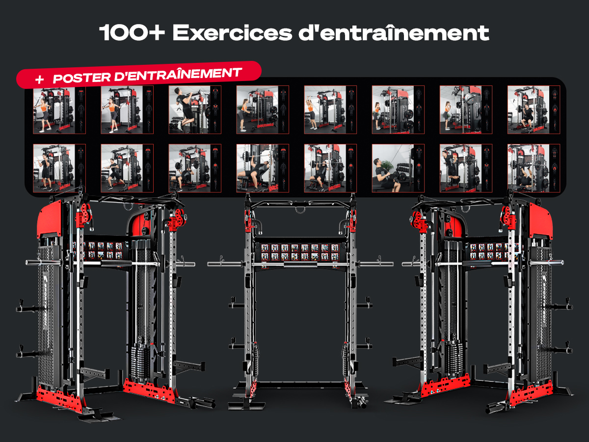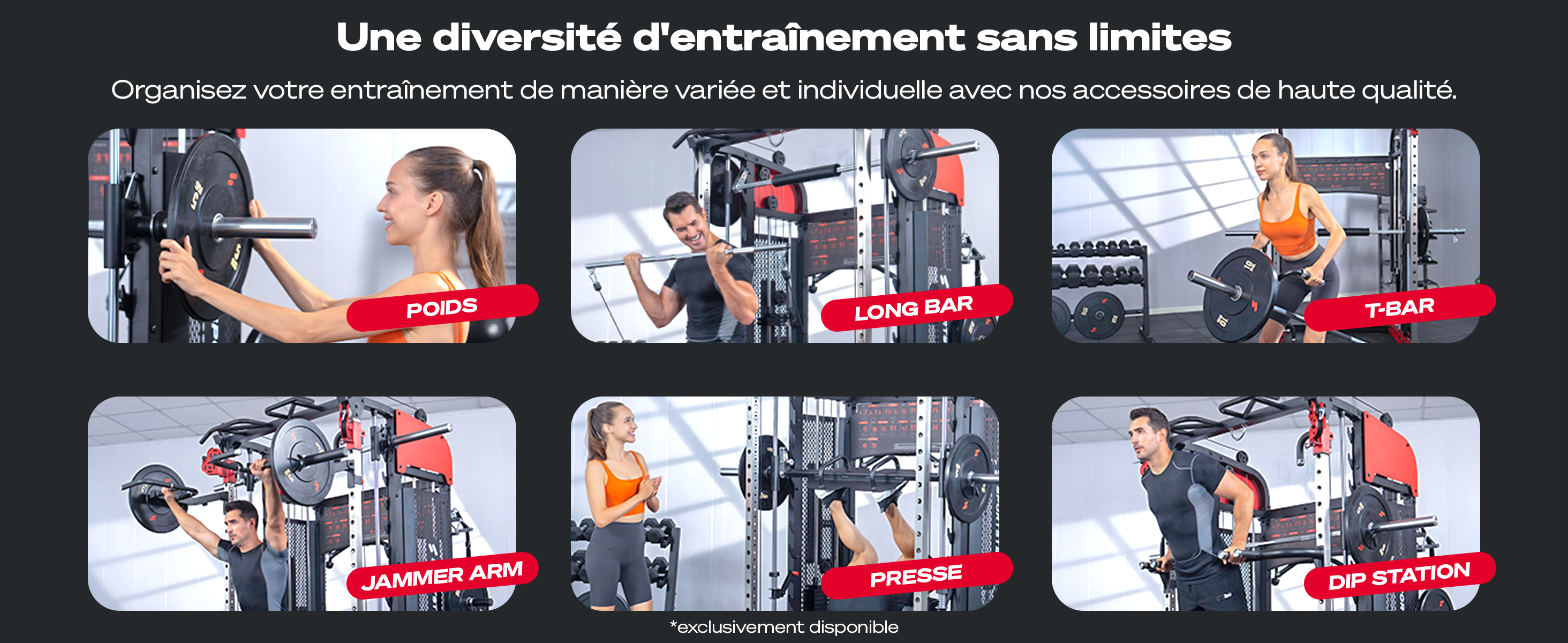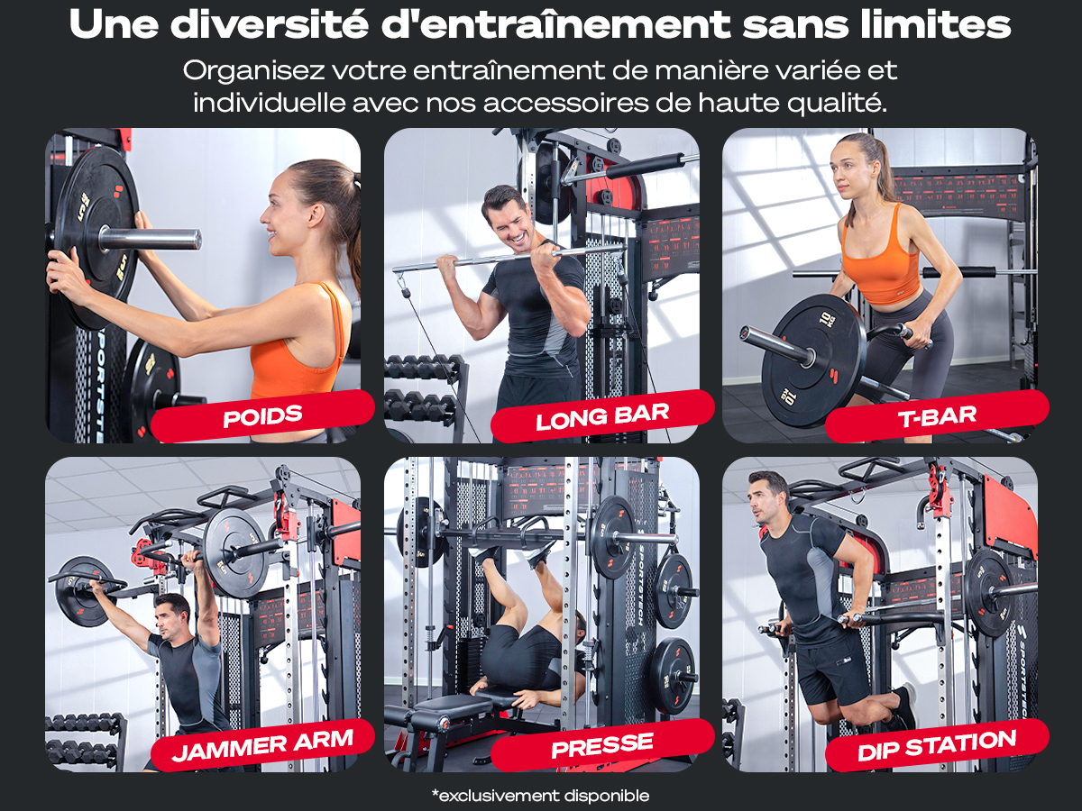 - Accessoires exclusifs en option : banc de musculation, protection de sol, disques de poids et bien plus encore