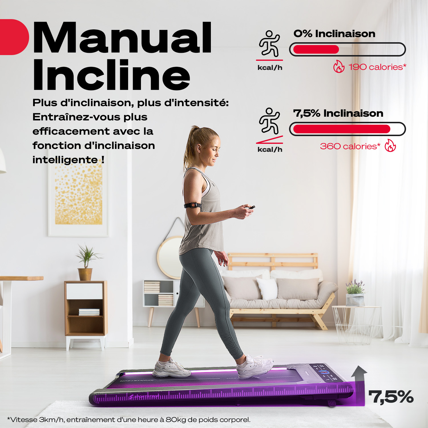 Améliore ta productivité, ta concentration et ta forme en transformant les moments passifs en petites séances de fitness. Au bureau ou en télétravail, ou simplement pour bouger dans ton salon — le sWalk est prêt à tout moment. Pendant une visio avec les collègues ou en écoutant ton podcast préféré, tu restes actif·ve et atteins tes objectifs forme presque sans y penser, bien avant la fin de la journée.