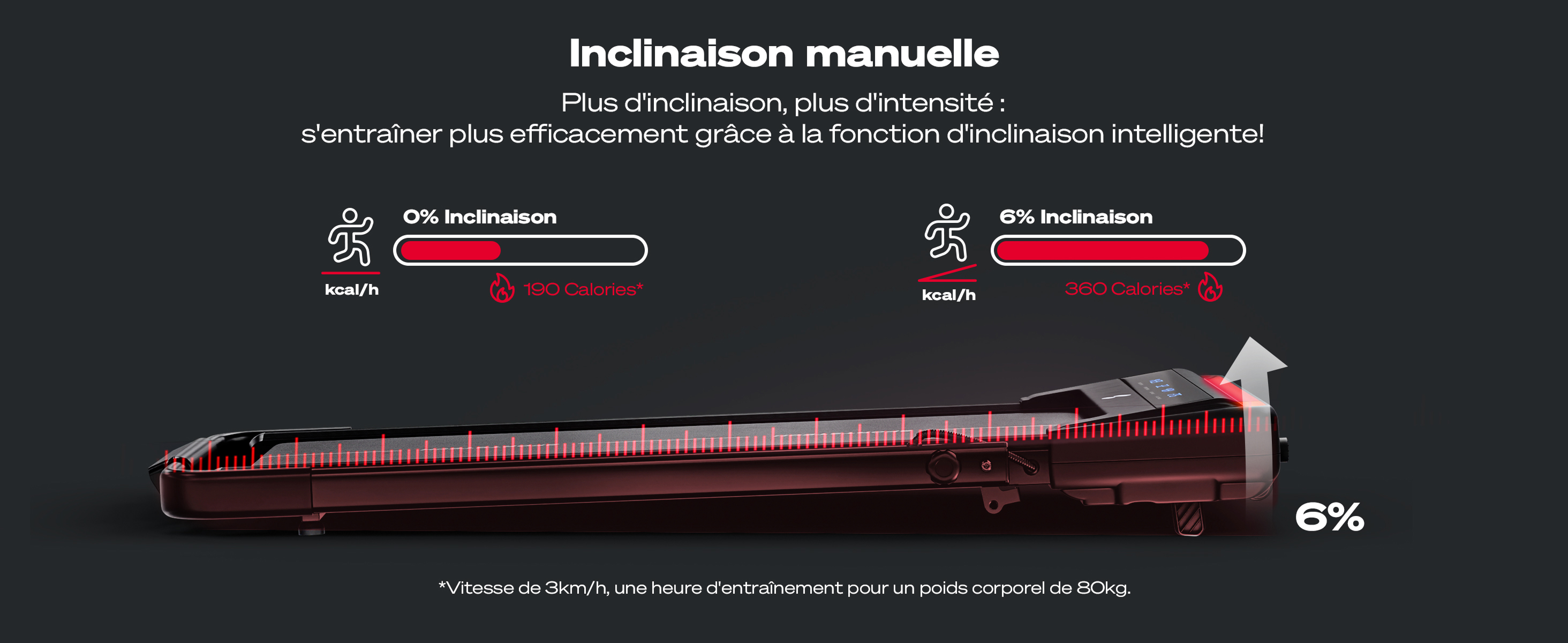 Oui, le sWalk Lite Plus offre une inclinaison de 11,5 % pour un entraînement plus intense. Les supports d’inclinaison se trouvent à l’avant sous le moteur et doivent être déployés manuellement pour régler l’inclinaison.